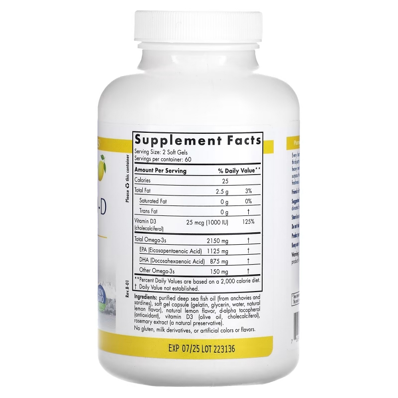 Очищенное глубоководное рыбье масло (от анчоусов и сардин), мягкая гелевая капсула (желатин, глицерин, вода, натуральный лимонный аромат), натуральный лимонный аромат, d-альфа-токоферол, витамин D3 (холекальциферол в оливковом масле), экстракт розмарина (натуральный консервант).